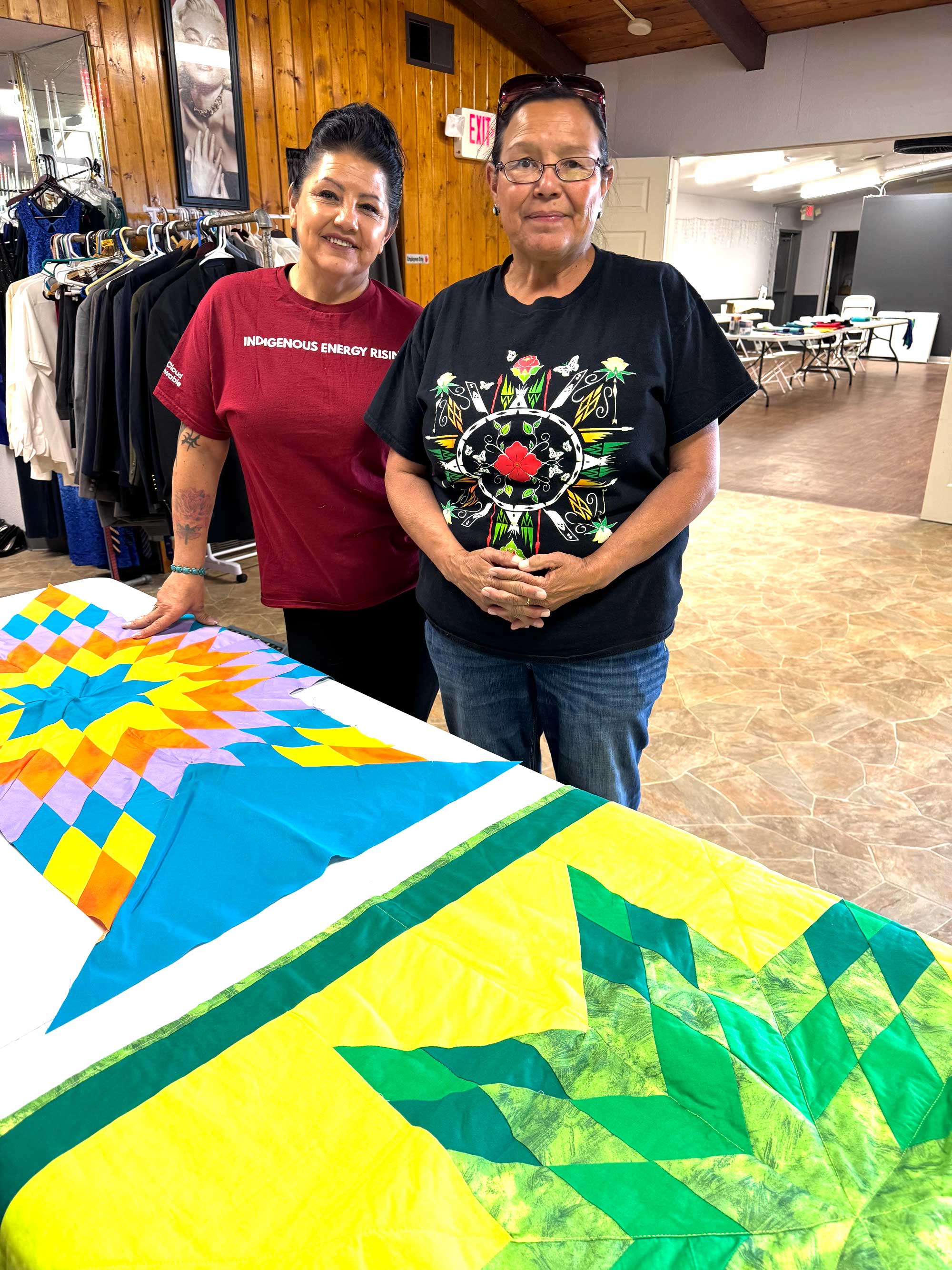 Figure 1: Cherokee Brown, left, and Shine Tidzump stand with a star quilt created through a Wyoming Arts Council Folk and Traditional Arts Mentoring Project Grant. Brown received the mentoring grant to teach traditional star quilt making, supporting the continuation of cultural knowledge through hands-on instruction.