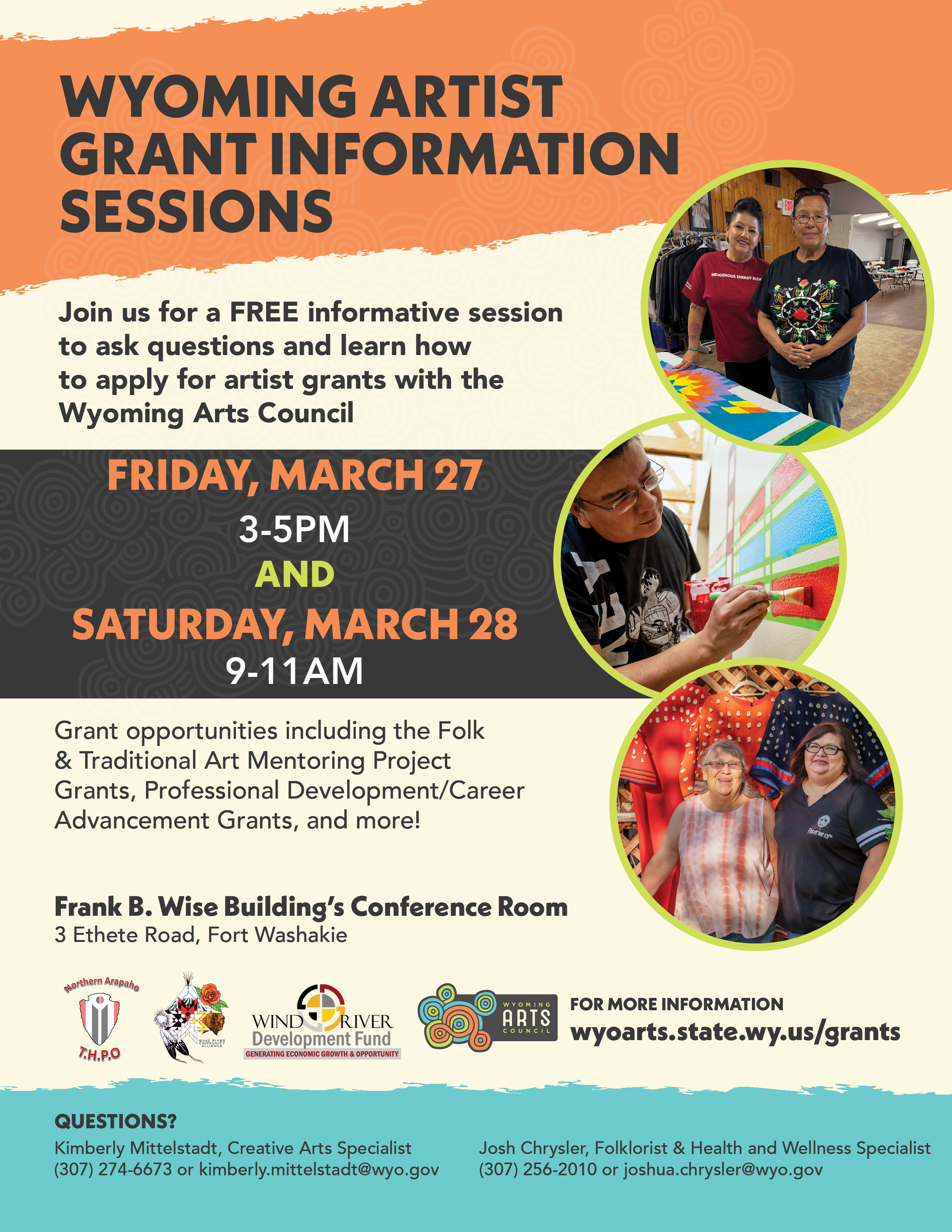 FORT WASHAKIE, Wyo. – March 6, 2026 – The Wyoming Arts Council will host two free grant information sessions for artists and community members on March 27 and 28 in the conference room of the Frank Wise Building, 3 Ethete Road, in Fort Washakie.